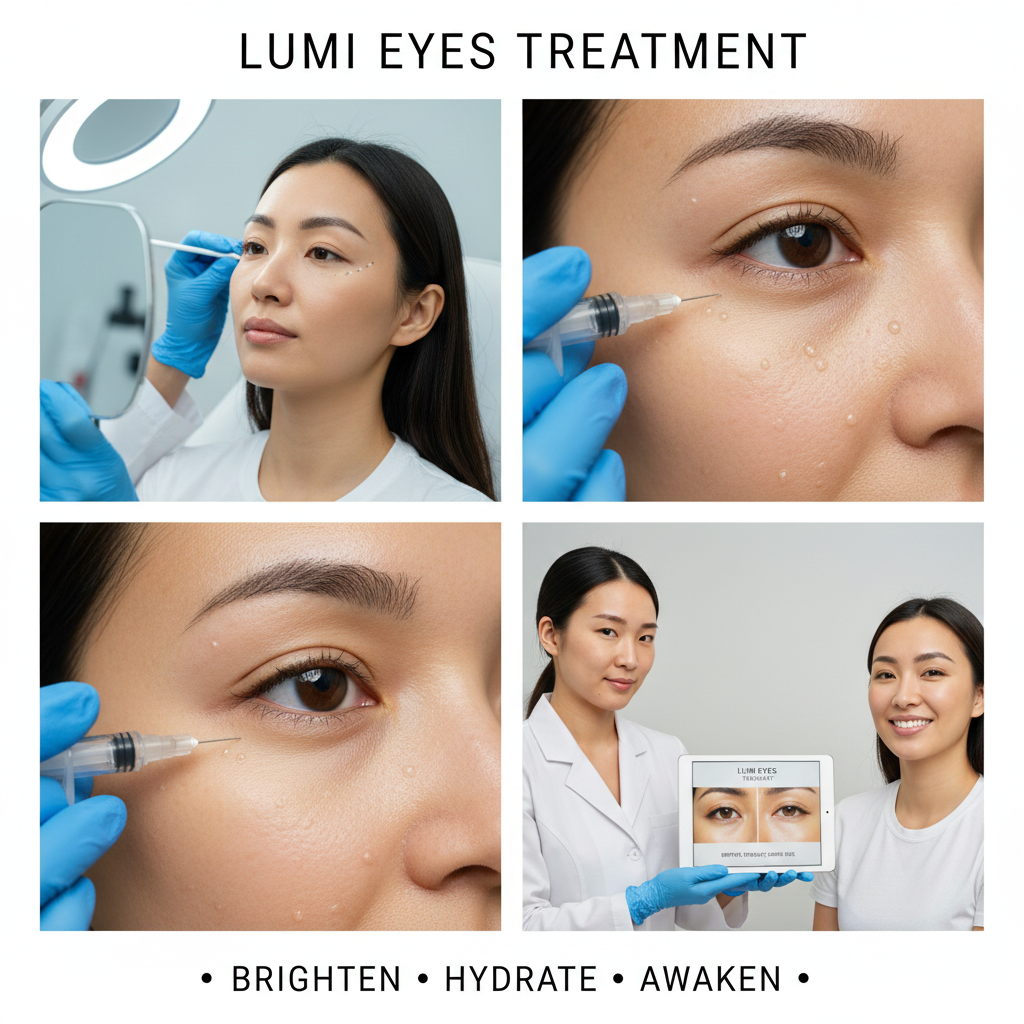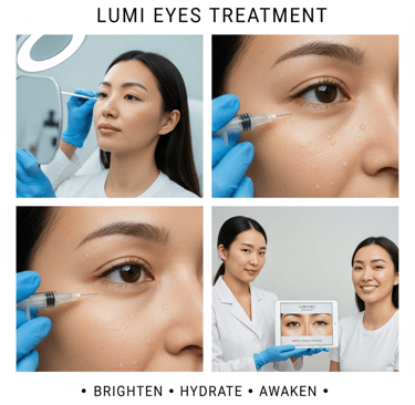 Lumi Eyes is a non-surgical injectable skin booster specifically designed to treat dark circles, under-eye hollows, fine lines, and tired-looking eyes. It works by deeply hydrating and regenerating the delicate under-eye skin, giving a brighter, fresher appearance.